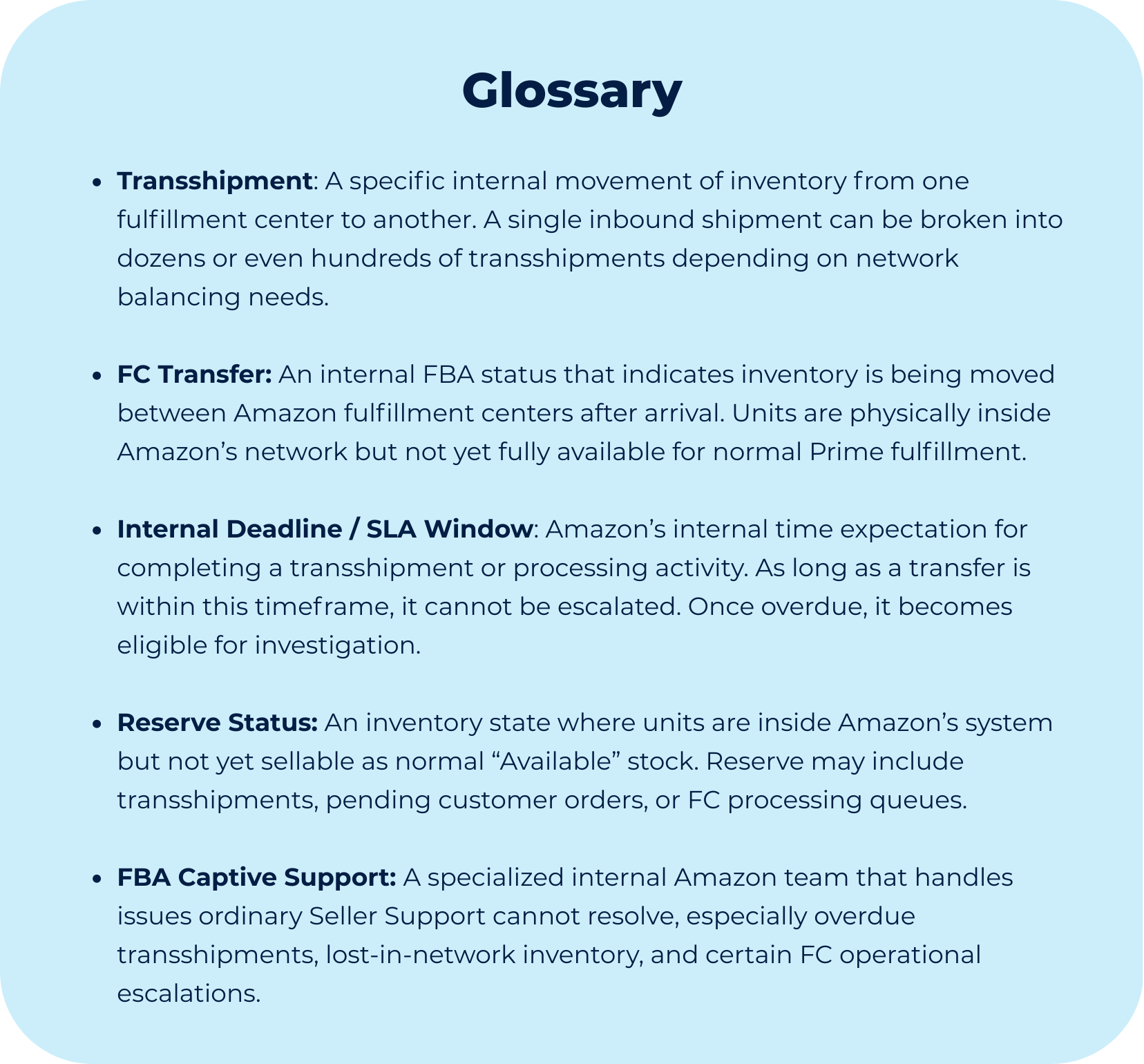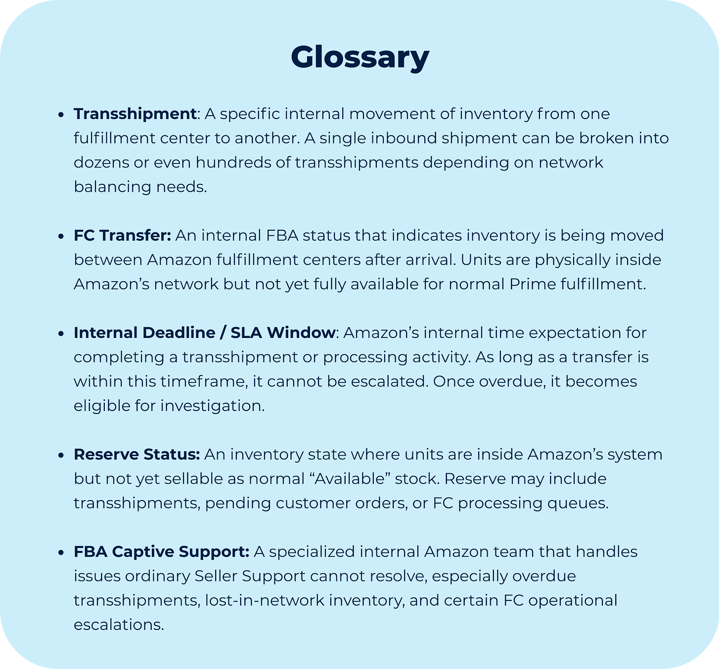 This is where many operators fall into traps. They assume inventory is “just transferring” and simply wait, or they open general cases asking Seller Support to “expedite FC transfer,” hoping someone in the background will flip a switch. Instead, this case required a different question: Instead of asking why it’s delayed, ask: How is Amazon moving my inventory from FC to FC?
