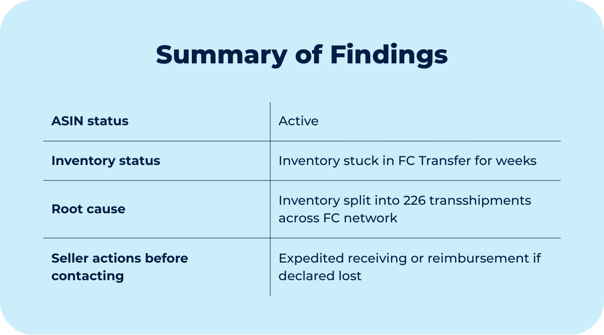 This case didn’t begin with a lost shipment, stranded inventory, or an inbound discrepancy. It began with something most experienced sellers have seen at least once: inventory that arrives at Amazon, but never seems to become available, a.k.a stuck in FC Transfer.