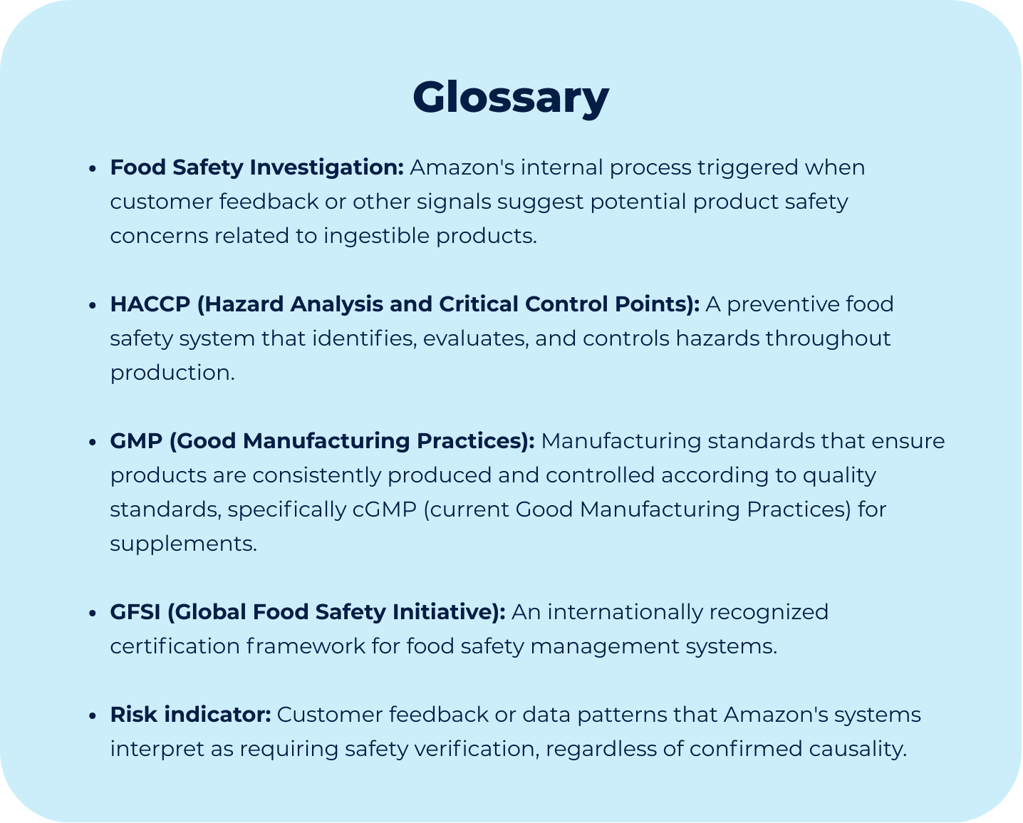Amazon’s Food Safety Investigation process is designed to verify that products meet recognized manufacturing and safety standards when risk indicators appear. The customer review functions as a trigger, it moves the ASIN into a verification workflow, where Amazon evaluates whether the seller operates under controls it recognizes as sufficient.