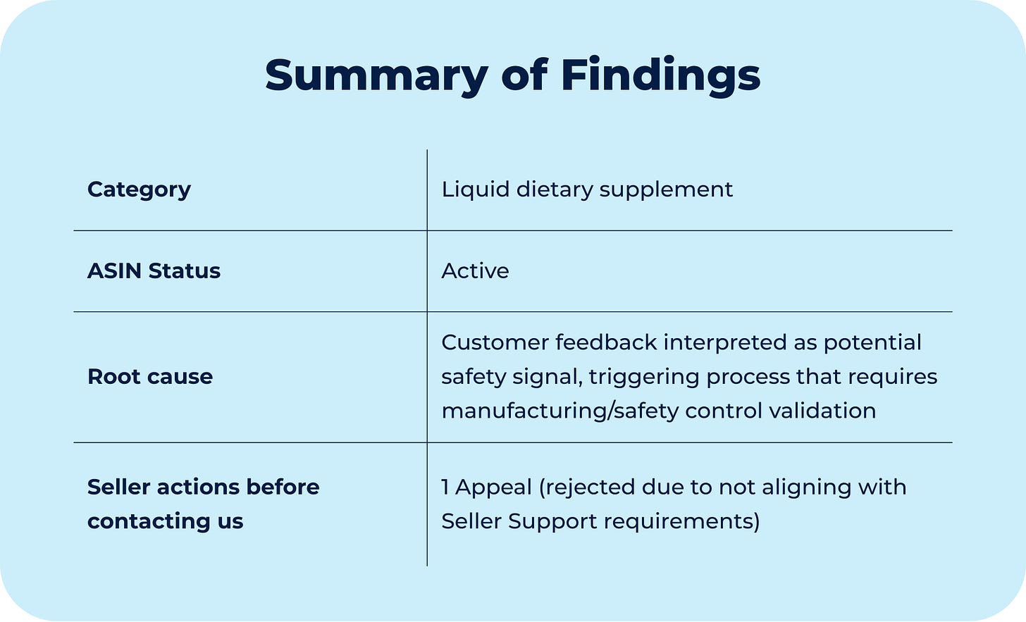 At this stage, the seller was not being accused of selling an unsafe product. The issue was that Amazon had received customer-reported health feedback significant enough to trigger a formal safety review, shifting the burden to the seller to demonstrate compliance with Amazon’s food and supplement safety requirements.