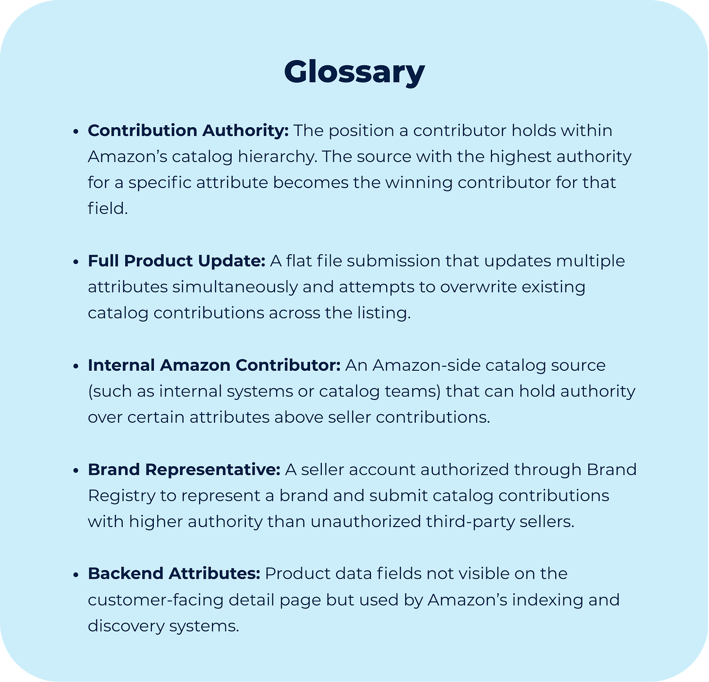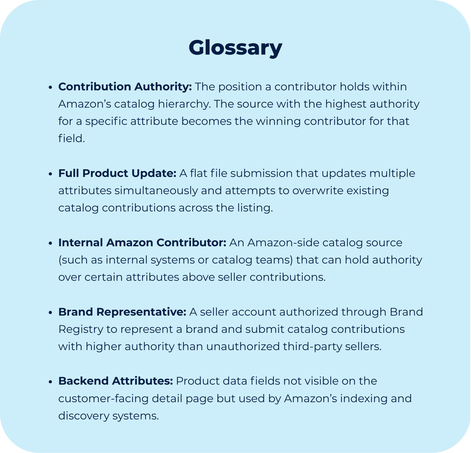 This is the starting assumption most brand representatives bring into situations like this. Brand Registry elevates the authority of contributions above unauthorized third-party sellers. If a brand representative submits a competing value, their contribution will typically replace those from lower-authority sources. However, if the brand representative has never submitted a contribution for a given attribute, the system simply keeps the existing one, even if it was originally submitted by a lower-authority seller.