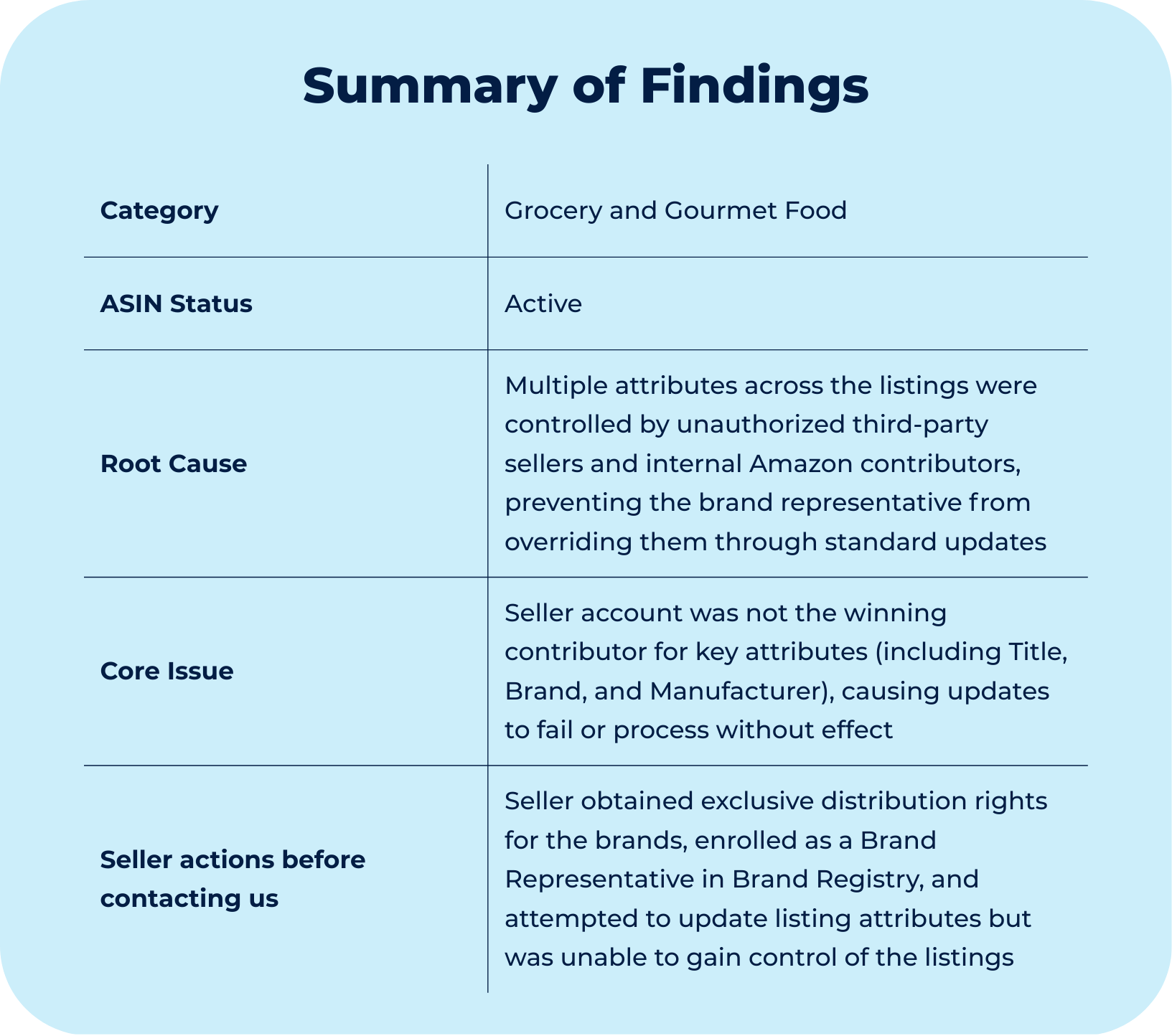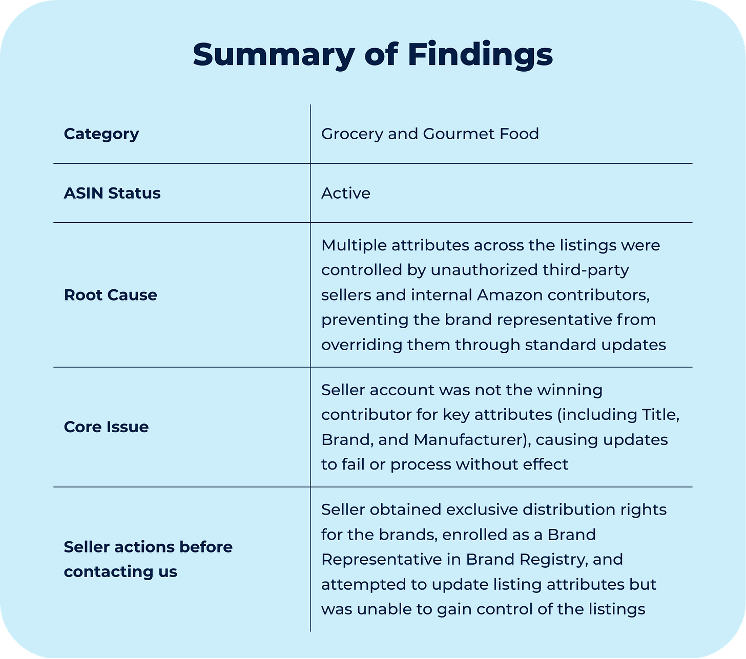 During the investigation, several attributes across the five ASINs were found to be controlled by a combination of unauthorized third-party sellers and internal Amazon contributors. Two of the listings contained attributes held by internal contributors, including critical fields such as the title, brand, and manufacturer.