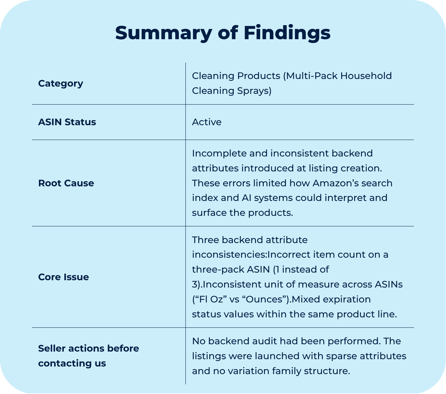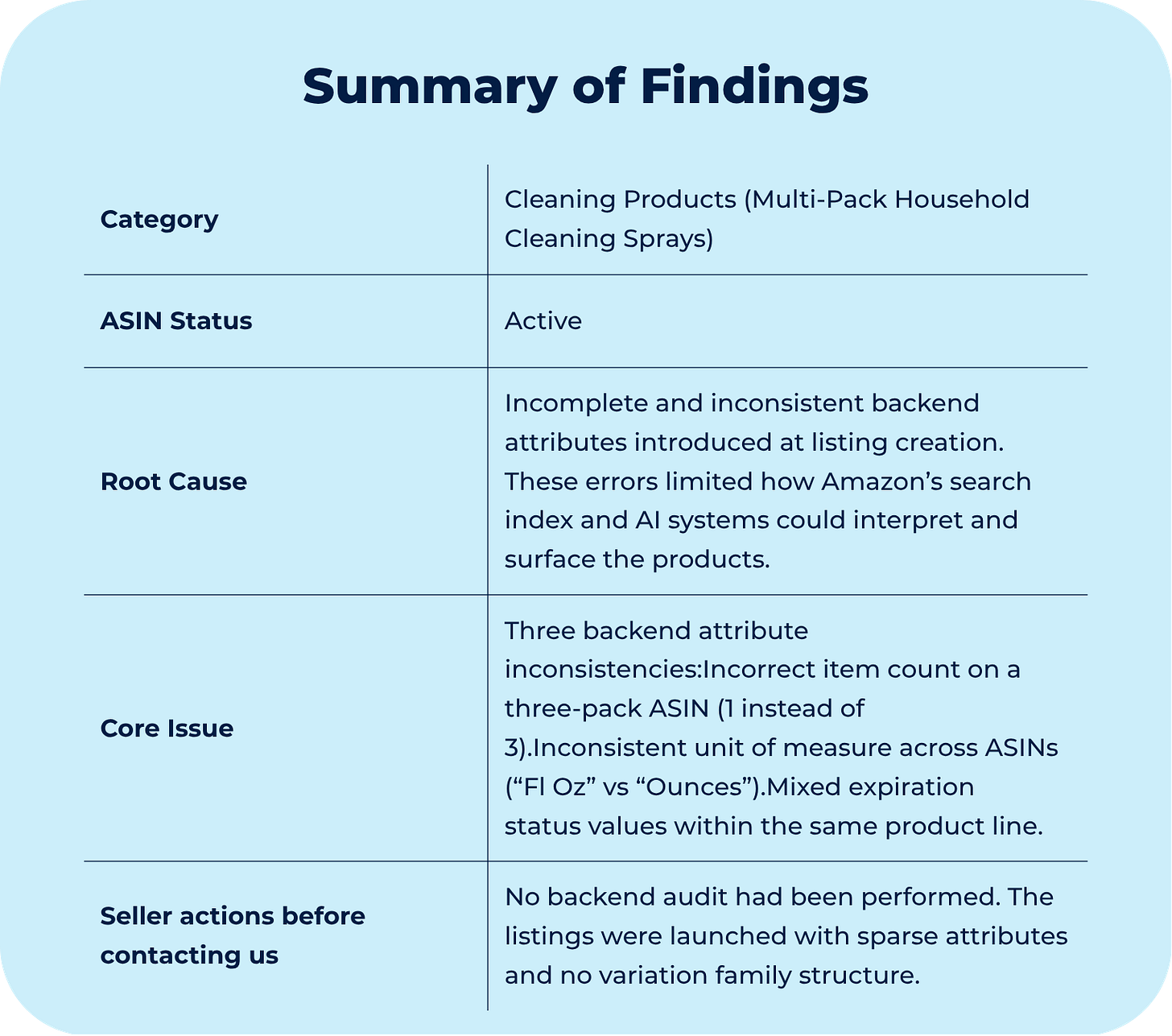 That was part of the reason these products were underperforming. The listings had been created without a backend audit. The content was sparse, key attributes were empty or incorrect, and the system had no variation structure to consolidate the catalog around a single detail page. Individually, each gap was small. Together, they added up to a system that did not have enough information to rank confidently.