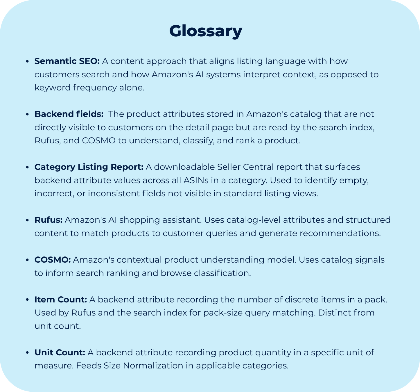The second is the AI context layer. Rufus and COSMO construct their understanding of a product from catalog data. When a customer asks Rufus for a product recommendation, it surfaces products for which it has sufficient structured context to generate a confident answer. So, a thin or inconsistent backend record does not produce a negative signal, it produces an absence of signal. And absence disadvantages the product in every recommendation.