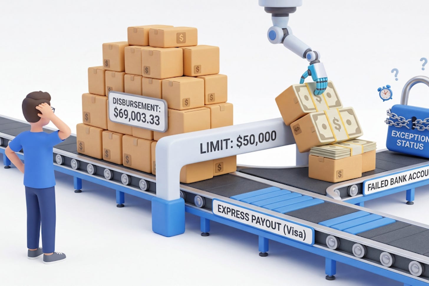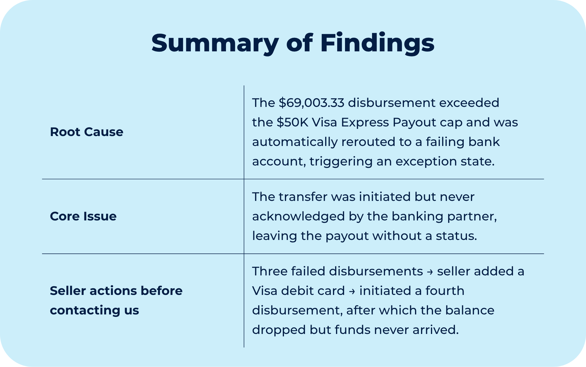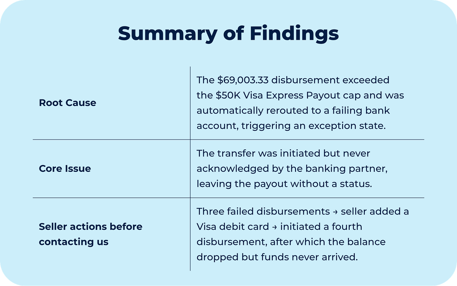 The issue originated at the routing stage and traces back to a policy: Express Payout through a Visa debit card carries a hard limit of $50,000 per transaction. When a disbursement exceeds that amount, the system does not decline it. Instead, it reroutes automatically to the active bank account on file.