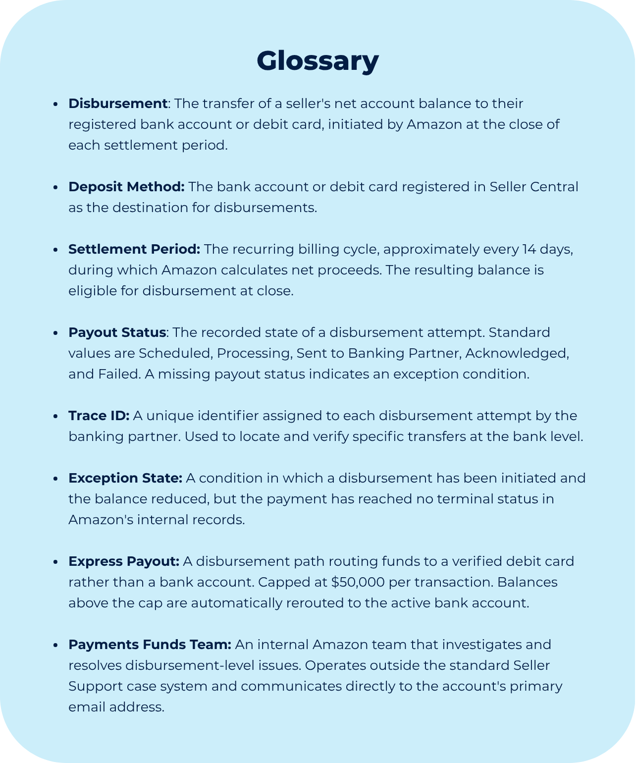Additionally to that (and this matters for the case), sellers do not often initiate disbursements manually, simply because Amazon processes them automatically at the close of each settlement period, roughly every 14 days. A seller can also request a manual disbursement at any time, provided their account is in good standing and their deposit method is verified.