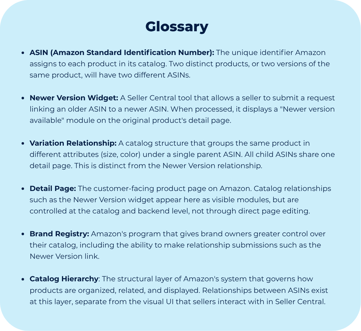 There is another type of relationship on Amazon called âNewer Versionâ relationship, which works differently, and the distinction matters. It is not for products that differ by size or color. It is for products where one is a genuine upgrade of the other: same core product, same function, same intent, but improved.