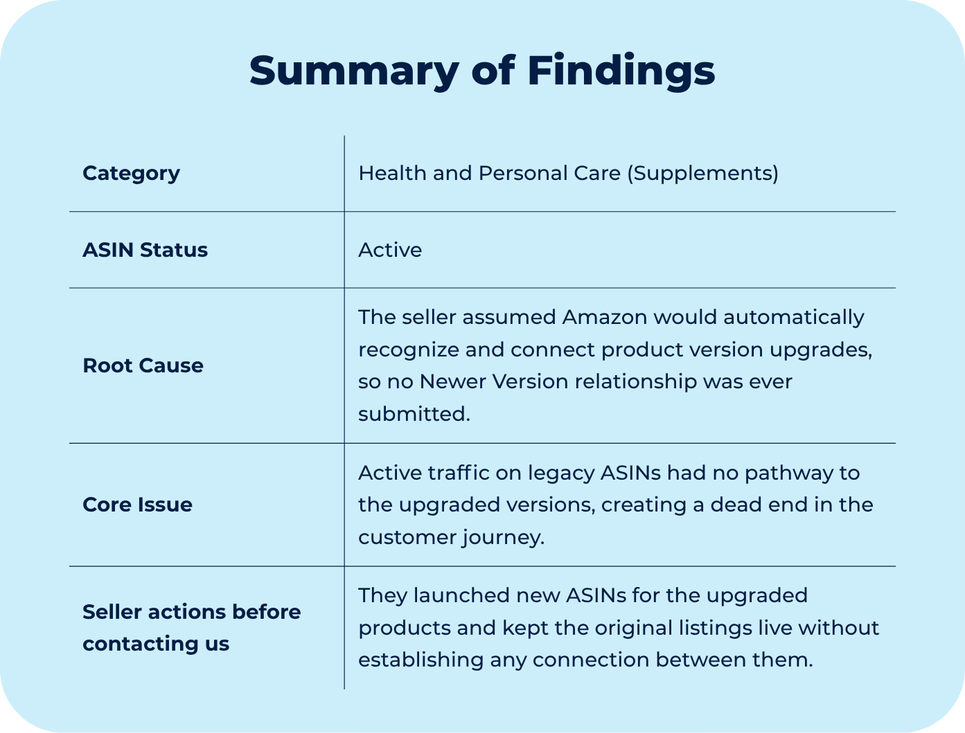 The catalog looked clean from the inside, the new ASINs were live, the old ones were still generating organic traffic, and the brand was preparing to phase out the older format over time.