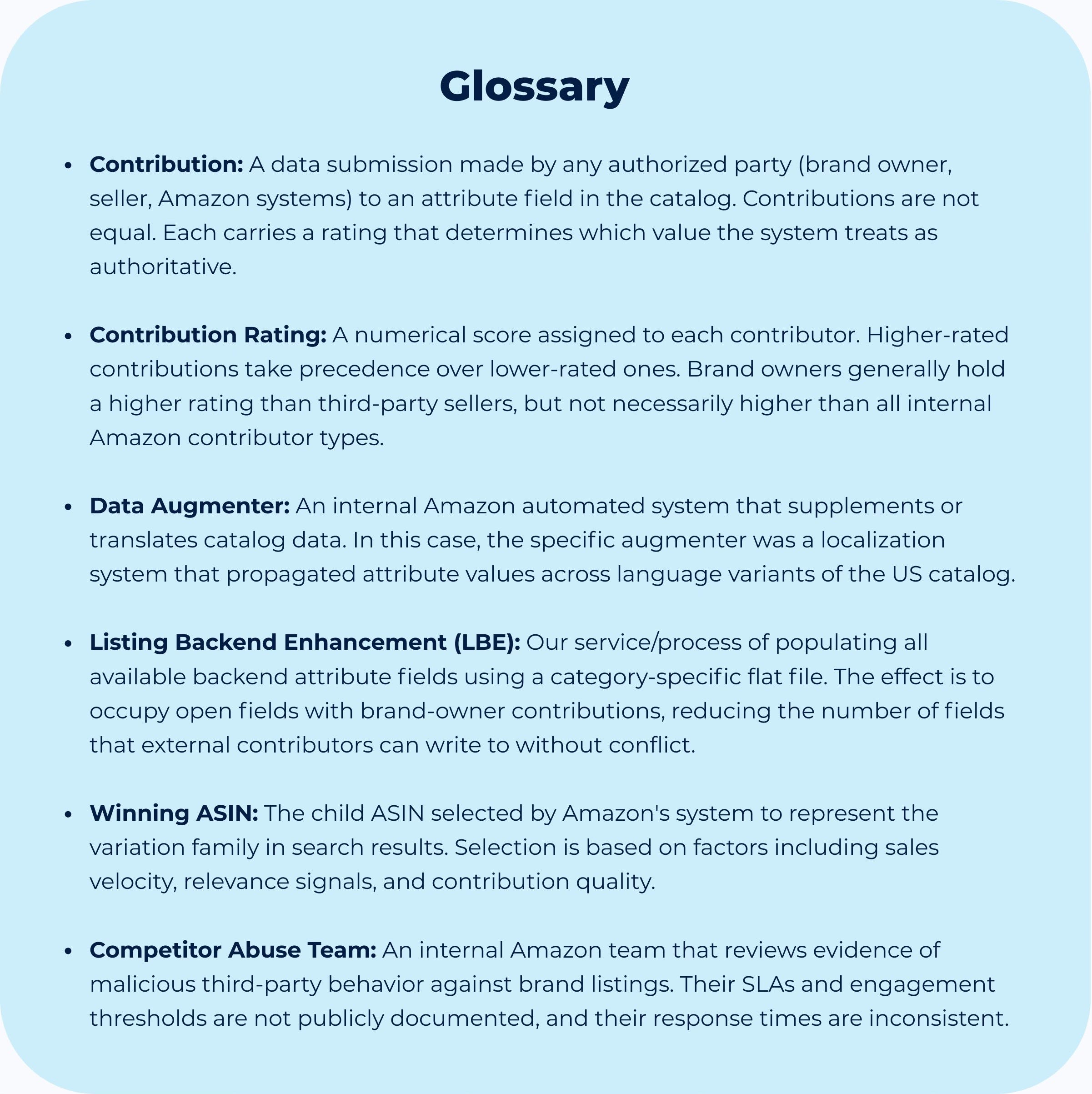 The initial assumption was straightforward: Brand Registry provides catalog authority. If you are the brand owner and your contributions have a higher rating than any third-party contributions, the system protects the listing from unauthorized edits.