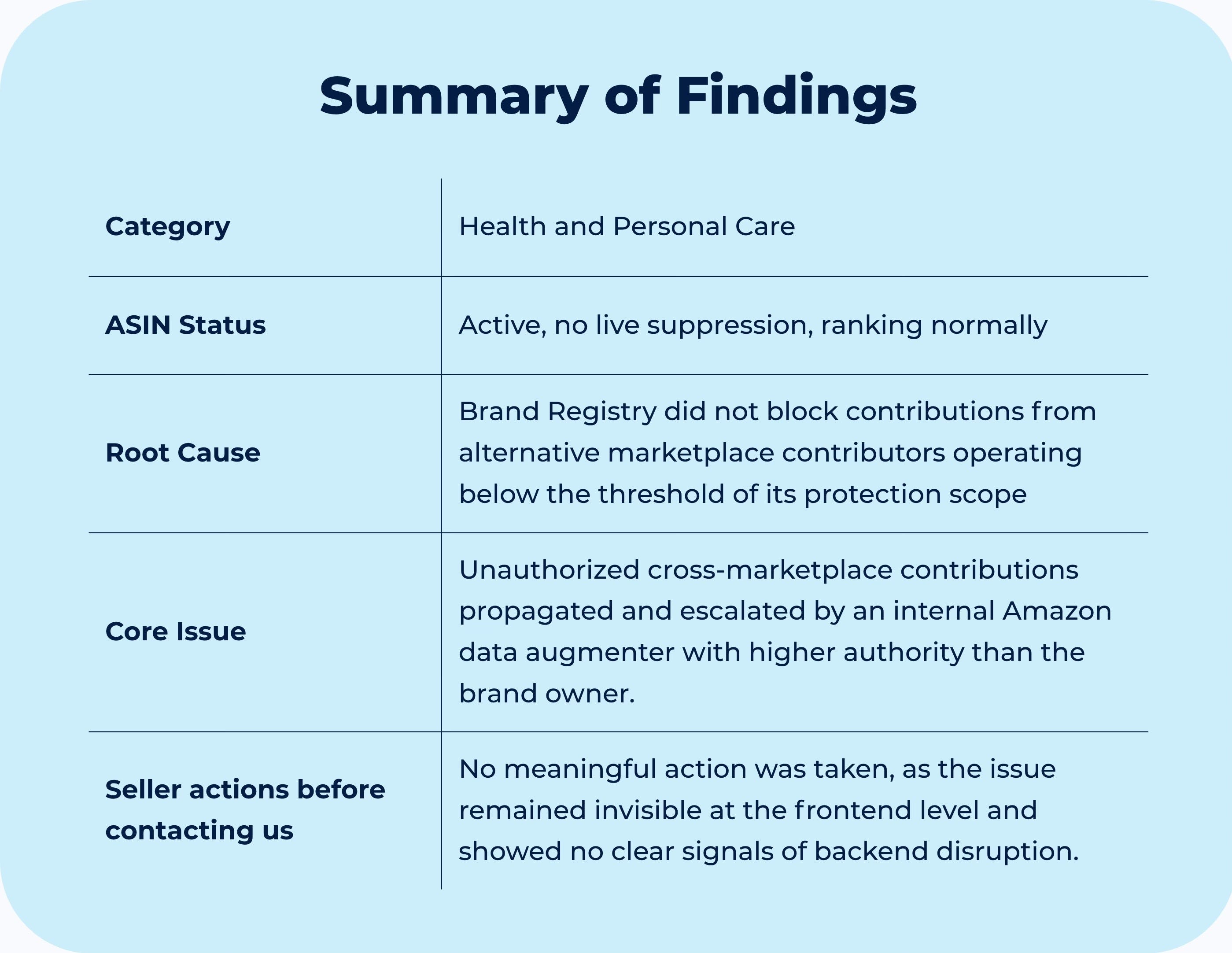A third-party seller pushed backend attributes, and an Amazon data augmenter amplified them across languages, overriding the brand owner despite Brand Registry.